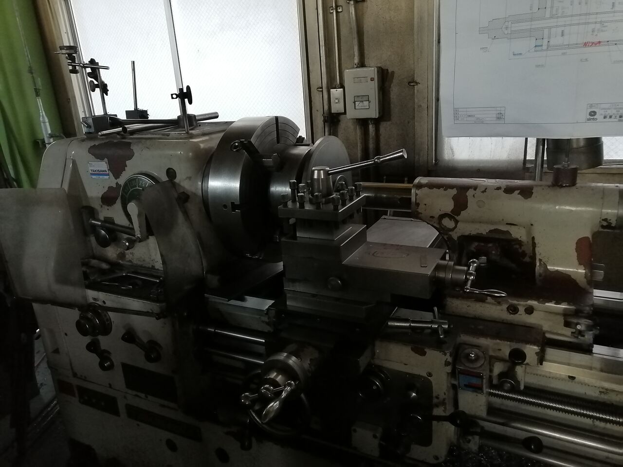 材料が入荷した段階では図面寸法より大きく組み込みができない状態のため、旋盤と呼ばれる工作機を使用して部品ごとに加工をしていきます。この工程はL1とか呼ばれたりします。外筒パイプや軸、フランジ等の黒皮を除去し、組み込み前の寸法に削っていきます。