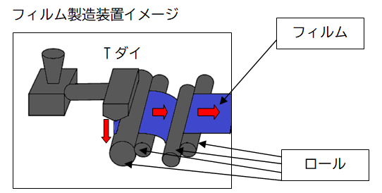 フィルムは原材料となる樹脂を溶かして作られています。樹脂はTダイと呼ばれる部品から溶け出てきた際冷却ロールで冷やされはじめてフィルムの形になります。その後、延伸という工程を経て巻き取られ完成するのですが、成形~搬送まで全ての工程において工業用ロールが使用されています。