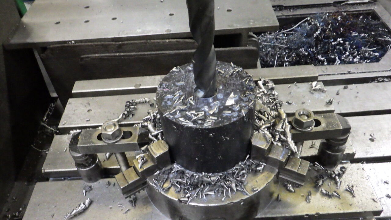 続きまして、使用用途によっては内部に熱媒が流れる仕様の場合があるので流路を設けるために必要に応じて穴あけを行います。