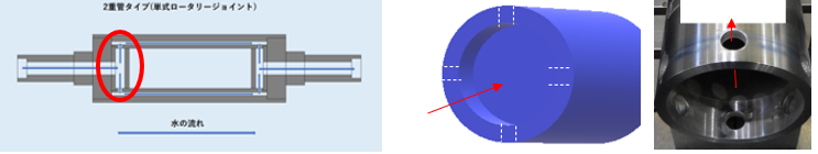 内部のパイプをどのような状態で組み付けるかにより構造は変わりますが、基本的な考え方としては軸から入ってきた熱媒が外側パイプの内径と内側パイプの外径を通るようにします。