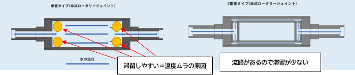 2重管構造になっていると流路ができるので単管構造に比べて滞留が少なく循環がスムーズです。