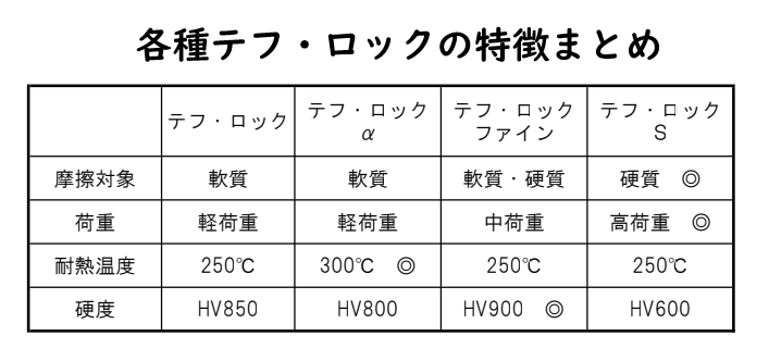 これらの理由によって従来のテフ・ロックでは耐えられなかったような高荷重下の磨耗状況であっても低摩擦を維持し、優れた耐摩耗性を発揮します。